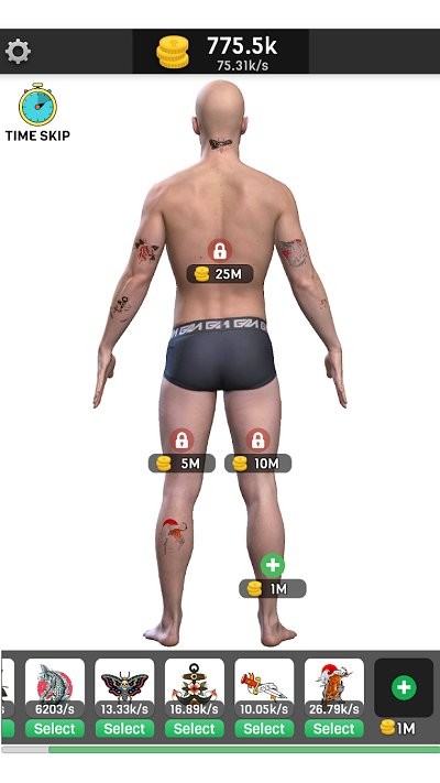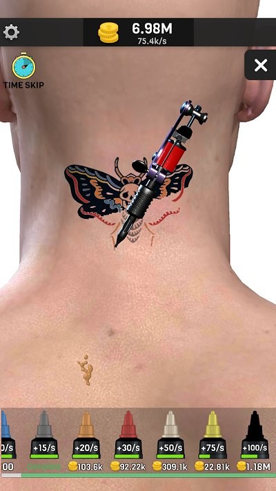 游戏中的每个纹身图案都需要用金币解锁,玩家需要通过完成任务和满足顾客需求来赚取金币,从而扩大自己的纹身库。