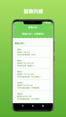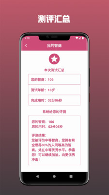 智商测试是一款专业且高效的智力评估工具,旨在为用户提供科学、准确的智商测量服务。软件采用国际通用的标准测试题库,包含60道精心设计的题目,通过限时答题模式全面评估用户的逻辑思维、分析能力和认知水平。测试结束后,系统会根据年龄自动生成详细的智商报告,并支持将成绩上传至全球排名榜,让用户了解自己在同龄人中的智力水平。界面简洁友好,操作流程清晰,无论是想了解自身智力潜力,还是进行趣味挑战,这款应用都能满足您的需求。