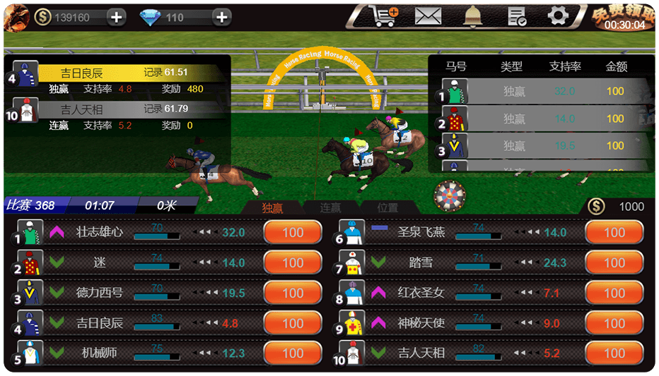 游戏采用次世代引擎打造的赛马场景堪称移动端画面标杆,动态天气系统让每场比赛都充满变数。专业的赛事分析工具能实时显示马匹状态曲线和赛道适应度,帮助玩家做出精准判断。独创的"马匹基因"系统让每匹马都拥有独特的成长曲线,玩家需要像真正的马主一样关注爱驹的成长轨迹。