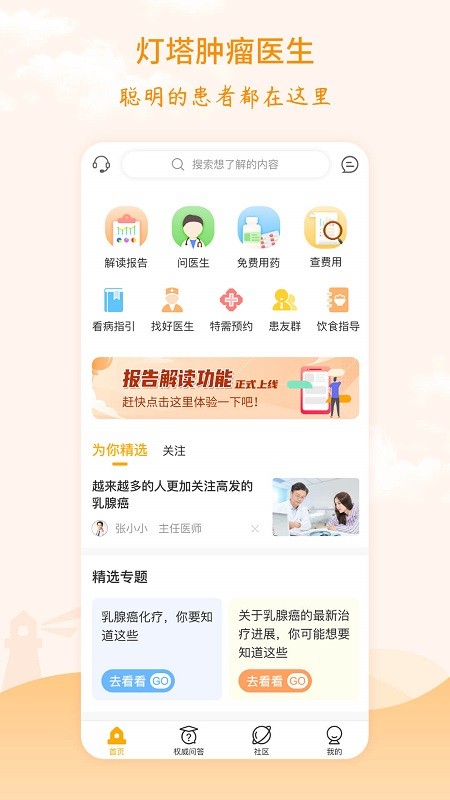 肿瘤公开课;每月邀请北京协和医院、MD安德森癌症中心等机构的权威专家,开展系列专题讲座,内容包含临床案例解析、用药指导、副作用处理等实用知识,支持课后在线答疑。