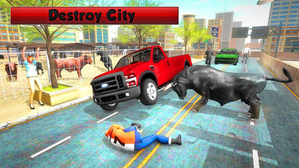 玩家将使用直观的虚拟摇杆和按键控制公牛在广阔的地图中自由行动,通过冲撞、踩踏等方式破坏场景中的各种物体,攻击NPC角色,体验最纯粹的破坏快感。