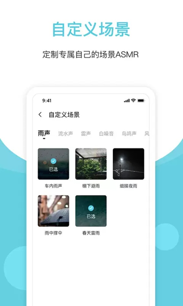 2.点击下方「自定义」按钮,进入分类页面,自由搭配雨声、雷声、鸟鸣等素材,创建专属混音场景。在这个界面,用户可以通过简单的拖拽操作来调整各个音源的比例和组合方式。