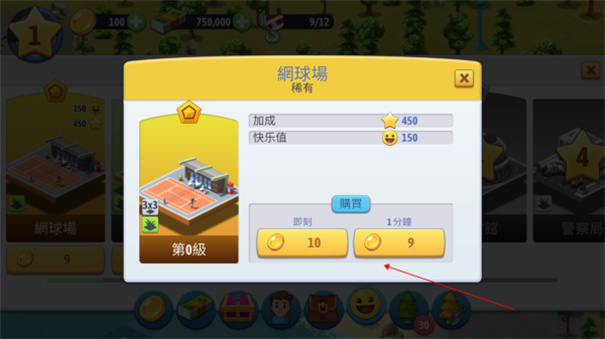 特殊设施如网球场需要相邻配置休息区才能生效,系统会通过气泡提示优化建议,长按设施可查看详细收益公式。