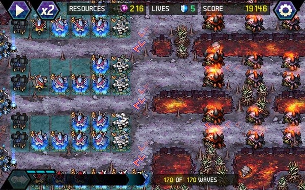 游戏采用经典塔防玩法,玩家需要在战略要地建造防御塔来阻挡敌人前进。通过点击防御塔可以进行升级,提升攻击力、射程或特殊效果。游戏引入优先级系统,玩家可以标记特定障碍物或敌人作为首要攻击目标。多样化的炮塔类型包括机枪塔、导弹塔、激光塔等9种基础防御设施,以及4种威力惊人的特殊武器,如核弹打击和电磁脉冲。游戏还提供速度调节功能,通过屏幕左上角的数字按钮,玩家可以在1倍和2倍速之间切换,适应不同战斗节奏。合理的资源管理和战术搭配是取得胜利的关键。