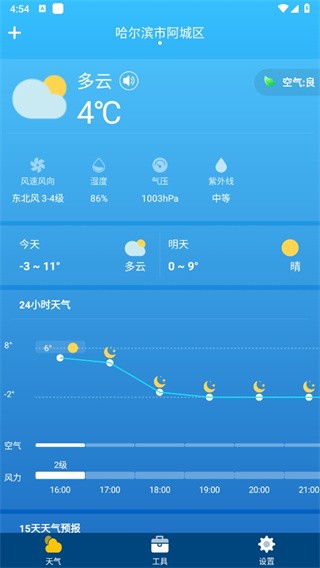 2、在天气的页面中可以看到温度、风速、风向等。主界面采用卡片式设计,各项天气指标一目了然。用户可以通过左右滑动查看不同时间段的天气详情,上下滑动则可查看更详细的天气分析报告。