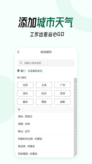 支持全国多个城市及地区天气查询;用户可以在"我的城市"管理页面添加多个关注地点,系统会以卡片形式展示各城市的天气概况,方便用户快速对比不同地区的天气差异。
