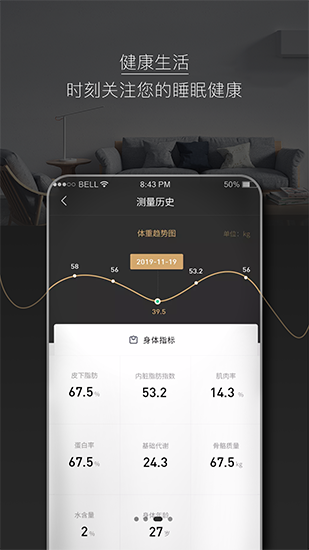 体脂测量:结合慕思智能体脂秤,精准测量用户体重、体脂率、肌肉量等多项健康指标,建立完整的健康档案,助力科学身材管理。