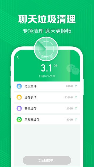【微信清理】智能微信清理,清理聊天缓存,朋友圈缓存等,加速手机。不仅能清理聊天记录中的垃圾,还能优化微信运行环境,显著提升微信的响应速度和使用体验。