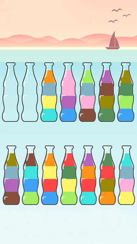 2、玩家需要将各种颜色的液体倒入对应容器中,通过合理排序完成分类任务。