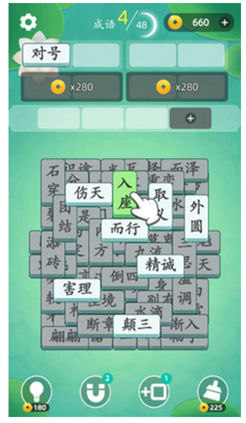 游戏主要以三种消除方式为主,玩家充分的收获轻松的消除乐趣,各种游戏关卡解锁,快速的加入进来,训练自己的大脑,变得越来越聪明,开启好玩的游戏内容,不断的闯关。新增的"成语实验室"功能,可以自由组合汉字创造新词,系统会智能判断是否符合成语构词规律,并给出文化渊源分析。