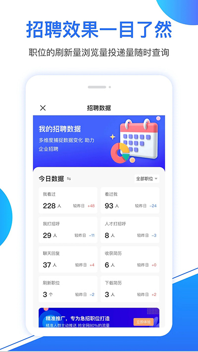 2、一站式招聘服务:从职位发布到面试安排,提供完整的招聘流程解决方案,是企业管理者的得力助手