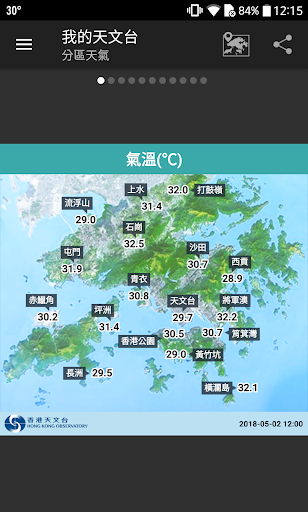 9.当本港局部地方有雷暴,而天文台发出的雷暴警告有描述受影响的区域时,应用程序主页上的雷暴警告图标会出现一个红点。按下图标时会显示一幅地图,以便查看受雷暴警告影响的区域。
