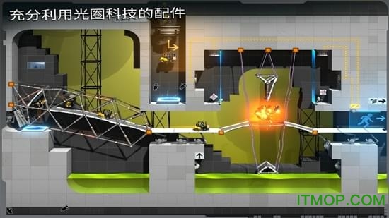 在光圈科技实验室中,你需要运用工程知识构建各种复杂建筑结构,注意平衡材料的强度与成本效益。游戏中有GLaDOS人工智能全程陪伴,她会给出专业建议,帮助你通过棘手的物理挑战。作为首款获得官方Portal授权的桥梁建造游戏,它完美融合了两个世界的精华元素。面对各种危险环境时,要特别注意避开岗哨炮塔的监视、分解网的切割、激光区的照射以及酸液的腐蚀。善用传送门实现空间跳跃,利用光圈弹射板获得动能,配合动力凝胶加速和排斥凝胶防滑等特殊道具,才能完成越来越复杂的建造任务。最终目标是确保测试车辆,无论是单独行驶还是车队行进,都能安全抵达终点线。