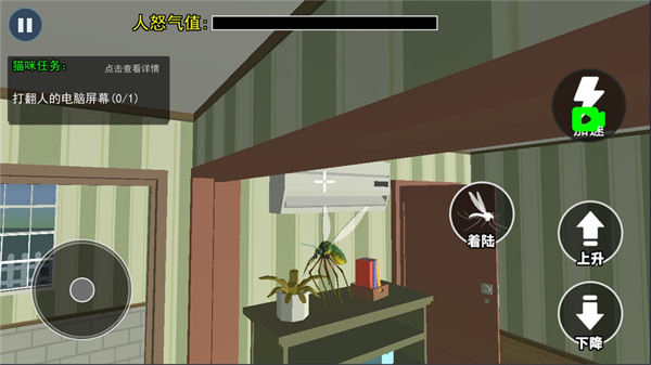 游戏采用直观的触控操作方式,通过屏幕右侧的按键可以精确控制蚊子的飞行高度和速度。玩家需要根据左上角的任务提示,完成特定的恶作剧行为来积累怒气值。怒气值系统是游戏的重要机制,它直接影响目标人物的反应速度和游戏难度。