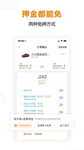 【消灭押金,无忧租车】芝麻信用分达到750分即可享受免6000元车辆押金服务,大大降低租车门槛。平台还提供车损免赔和乘客座位险,让您的出行更安心。