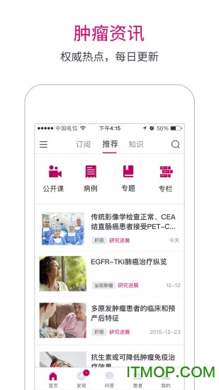 2.肿瘤公开课:平台课程库包含从基础到进阶的12个课程体系,涵盖30余个癌种。独家引进ASCO、ESMO等国际顶级会议的现场同声传译课程,保证中国医生第一时间获取全球最新进展。创新的"微课+直播+回放"三位一体教学模式,支持医生利用碎片时间学习。学员完成课程后可通过在线考试获得国家级继续教育学分,目前已认证学分课程达200余个。