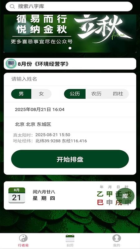 1、在软件首页选择排盘功能,准确填写姓名、性别和出生时间等信息,系统支持公历和农历两种输入方式,确保出生时间的准确性;