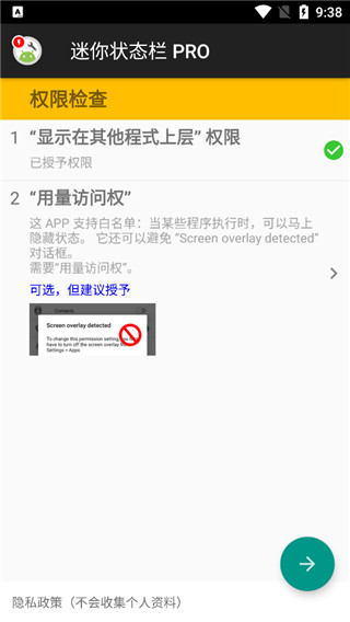 1、首先打开迷你状态栏Pro应用,点击右下角的权限管理按钮,进入系统权限设置界面。这里需要特别注意,为了确保软件正常运行,建议授予所有必要的权限。