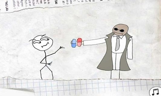 面对经典的红蓝药丸选择,无论选哪个似乎都不对。这关考验的是玩家的观察力,正确答案藏在主角身上。仔细看会发现主角的眼睛在闪烁,点击眼睛就能通过。这个设计暗示玩家要关注画面中的每个细节,包括看似无关的元素。