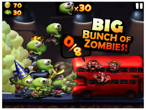 《僵尸尖啸ZombieTsunami》绝非普通的横版跑酷游戏,它创造性地将RTS元素融入跑酷玩法。游戏开始时你只是个形单影只的僵尸,但随着不断感染路人,你的队伍会像滚雪球般越来越庞大。除了要灵活躲避路障、沟壑等传统跑酷障碍外,更需要策略性地规划感染路线——有时需要分兵包抄,有时则要集中突破。当僵尸数量达到临界值时,甚至可以发动"僵尸海啸"技能,以摧枯拉朽之势碾过警车、压垮围墙。游戏精心设计了数十种特殊事件,比如遇到防暴警察时需要积攒足够数量的僵尸才能突破防线,而面对直升机扫射则要巧妙利用建筑物掩护。每个关卡都像在演绎一部荒诞又热血的僵尸逆袭大片。