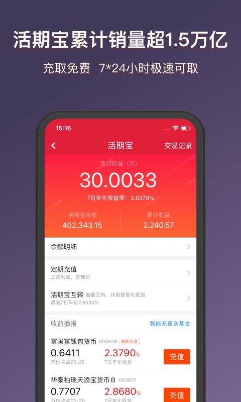 1. 活期宝:创新的现金管理工具,支持随时存取,取现完全免费,最快1秒到账,让您的闲置资金也能获得稳健收益。