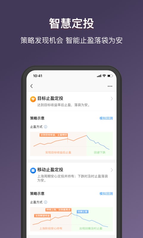 3. 智慧定投:智能化的定投系统配备止盈策略,帮助您把握市场机会,及时锁定收益,实现财富稳健增长。