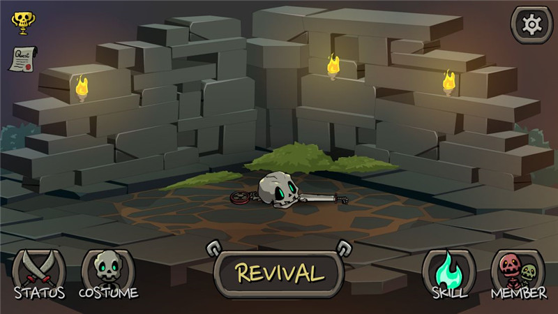 游戏采用创新的"复活成长"机制:开局时玩家控制的是一具支离破碎的骷髅遗骸,通过点击复活按钮开启冒险征程。战斗系统强调策略与操作并重,玩家需要在有限的生命值内完成指定作战目标。通过击败敌人可获得经验值用于提升基础属性,同时解锁包括旋风斩、骨刺突袭等30余种特色技能。游戏采用动态难度系统,随着玩家等级提升,会出现装备精良的人类骑士团、擅长魔法的牧师部队等强力敌人。