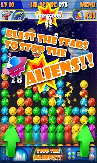 2、不明飞行物会随机出现在游戏界面中,玩家可以直接从下方点击星星将其销毁,但要小心它们的移动速度和轨迹变化,合理规划消除顺序是关键。