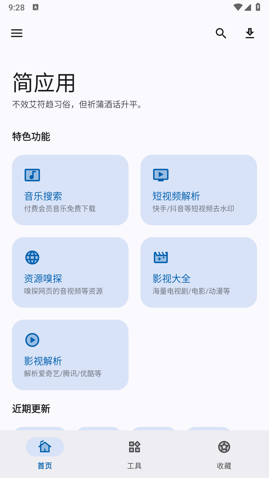 打开APP后,您可以在首页浏览到各种特色功能,例如音乐搜索、短视频解析、影视大片推荐等,这些功能都经过精心设计,操作简单直观。