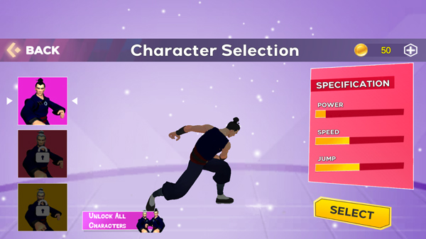 4、其次选择游戏角色,可用金币来解锁更多角色,每位角色都拥有专属技能和连招系统;