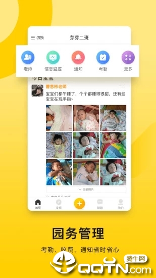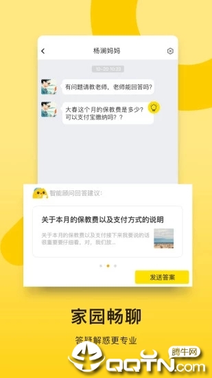 「用贝聊,园务管理好轻松」整合多项实用工具:【学费通】与支付宝深度合作,提供0手续费快速收款服务,收费周期从传统7天缩短至最快1天;【考勤管理】通过智能终端实时记录师生出入数据,自动生成统计报表,让园所安全管理更省心。