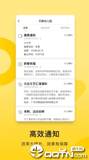 「用贝聊,通知群发更高效」采用智能分级推送机制,园长可一键发送全园通知,班主任可精准推送班级信息,配合未读提醒和消息置顶功能,重要通知传达率可达100%。