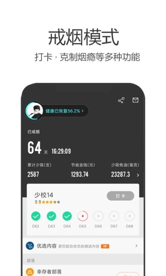 【军团更懂戒烟】我们采用军事化等级制度,让您的每个戒烟里程碑都充满荣誉感。当戒断反应出现时,系统会推送经过验证的缓解技巧。实时健康数据会展示戒烟带来的积极变化,而详尽的进步图表则让您的戒烟成果一目了然。