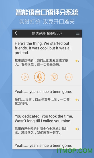 口语跟读:采用先进的语音识别技术,提供智能实时口语评分系统,支持逐句跟读逐词打分,并有专业发音示范,帮助用户快速攻克"开口说英语"的难关;