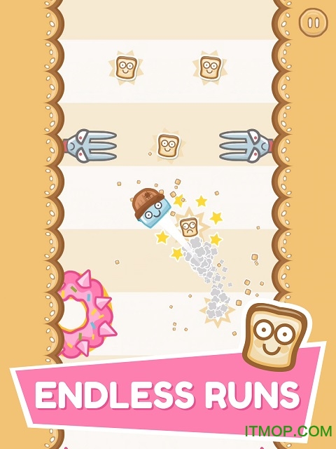 本作的整体画风可爱难度也适中适合所有年龄层游玩。游戏的操作方式简单易上手,但想要精通却需要一定的技巧。主角是一台造型百变的烤面包机,玩家需要通过精准的滑动操作控制它的弹跳轨迹。游戏中的障碍物设计充满创意,从危险的叉子到诱人的甜甜圈,每个障碍都暗藏杀机。道具系统为游戏增添了更多策略性,比如罐头道具可以固定弹射方向,咖啡杯则能实现空中悬停。无尽模式和关卡编辑器大大延长了游戏寿命,快节奏的过关体验让人欲罢不能。