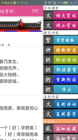 我的鉴赏:每首诗词都可以写下自己的感悟,记录学习心得,还能参考名家赏析,提升鉴赏水平。