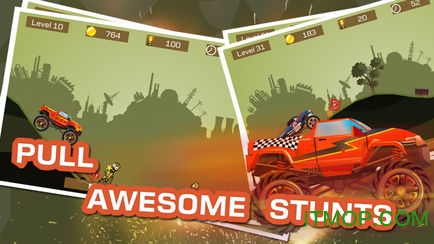 支持按键控制游戏,操作简单易上手,适合不同水平的玩家。沿途收集金币在商店里面购买新的车型,解锁更多酷炫的卡车外观和性能升级。按左边屏幕减速倒退,按右边屏幕前进加速,灵活操控卡车应对各种路况。空中旋转设备控制车辆角度,精准调整落地姿势以获得更高分数。商店里面购买vip卡可以获得更多时间,延长游戏体验。撞击油桶和僵尸获得高分,挑战排行榜,成为最强大的卡车司机。