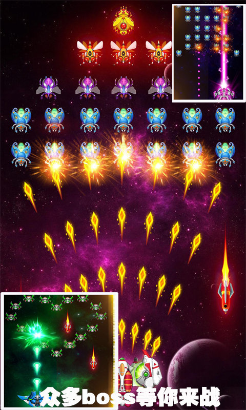 -史诗级boss战:游戏中登场的boss体型巨大到整个屏幕都装不下,玩家需要运用各种战术来应对这些庞然大物。不仅要击败boss本身,还要清除其召唤的大量敌机随从。战斗过程中,满屏飞舞的子弹和爆炸特效将带来前所未有的视觉冲击!