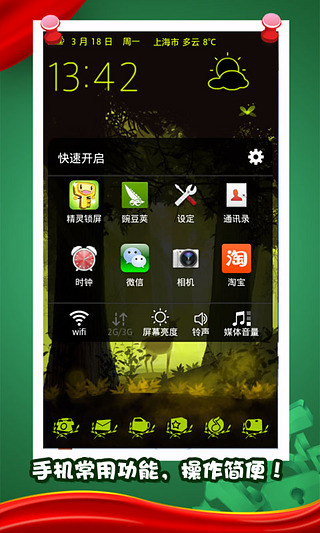 恶搞解锁功能让解锁变得不再简单,需要动点脑筋才能成功解锁屏幕,有效防止他人窥探;阿发讲述的幽默段子库持续更新,每天都能听到新鲜有趣的搞笑内容,让你在解锁时也能会心一笑;锁屏DIY功能支持自由创作,你可以随意涂鸦或添加个性化元素,让锁屏界面充满创意;一键相机功能响应迅速,遇到精彩瞬间时能立即抓拍,不错过任何美好时刻;实时天气功能提供精准预报,出门前就能掌握天气变化,做好充分准备;悬浮精灵设计精巧,可以快速启动常用应用,大大提升操作效率;音乐播放功能支持后台运行,无需解锁就能享受音乐,让娱乐更便捷;电筒功能亮度可调,在黑暗环境中能提供充足照明,满足各种需求;快速通讯功能让你无需解锁就能拨打电话或发送短信,紧急情况下特别实用。