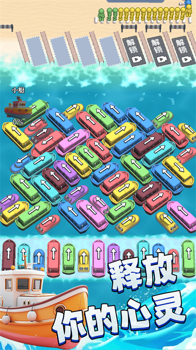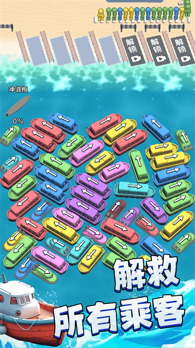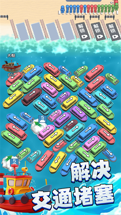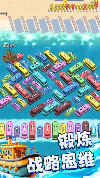 在游戏内玩家还需要注意合理移动轮船,游戏设置了真实的物理碰撞效果,如果轮船被堵住是无法离开的。玩家需要规划最优路线,安排所有人员安全离开才能通关,这种设计大大提升了游戏的可玩性和成就感。