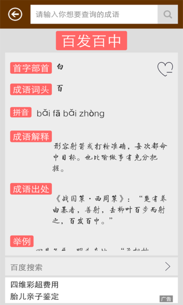 软件具备智能化的查询系统,支持多种检索方式。用户点击近义词或反义词即可跳转至对应词条的解释页面,实现知识点的网状学习。当需要更深入的信息时,可一键切换到百度进行扩展查询。部分成语配有生动的故事讲解,甚至提供形象直观的视频演绎,让学习过程更加有趣。独创的收藏功能让用户可以标记重点成语,建立个人知识库。这些特色功能共同构成了一个立体化的学习体系,让成语学习不再是枯燥的记忆,而是一场文化探索之旅。