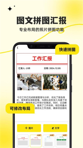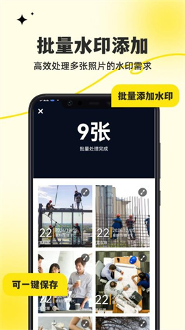 强大的图文拼图功能提供多种专业布局选择,帮助您将多张照片组合成条理清晰的工作汇报,让您的展示更加生动直观。2、针对大批量照片处理需求,软件支持一键批量添加水印功能,大幅提升工作效率,让繁琐的水印添加工作变得轻松简单。3、拍摄完成后,照片可自动保存至本地相册,并支持快速分享到社交平台,让您的工作成果能够及时与同事或客户分享交流。