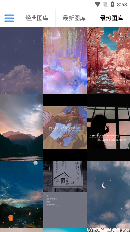 【分类&内容多】壁纸库拥有20多个精心设计的分类标签,涵盖情感语录、心灵鸡汤、明星写真、萌宠图集、自然风光、情侣壁纸等丰富内容。每个分类下都有数千张精选壁纸,满足不同用户的个性化需求,总有一款能打动您的心。