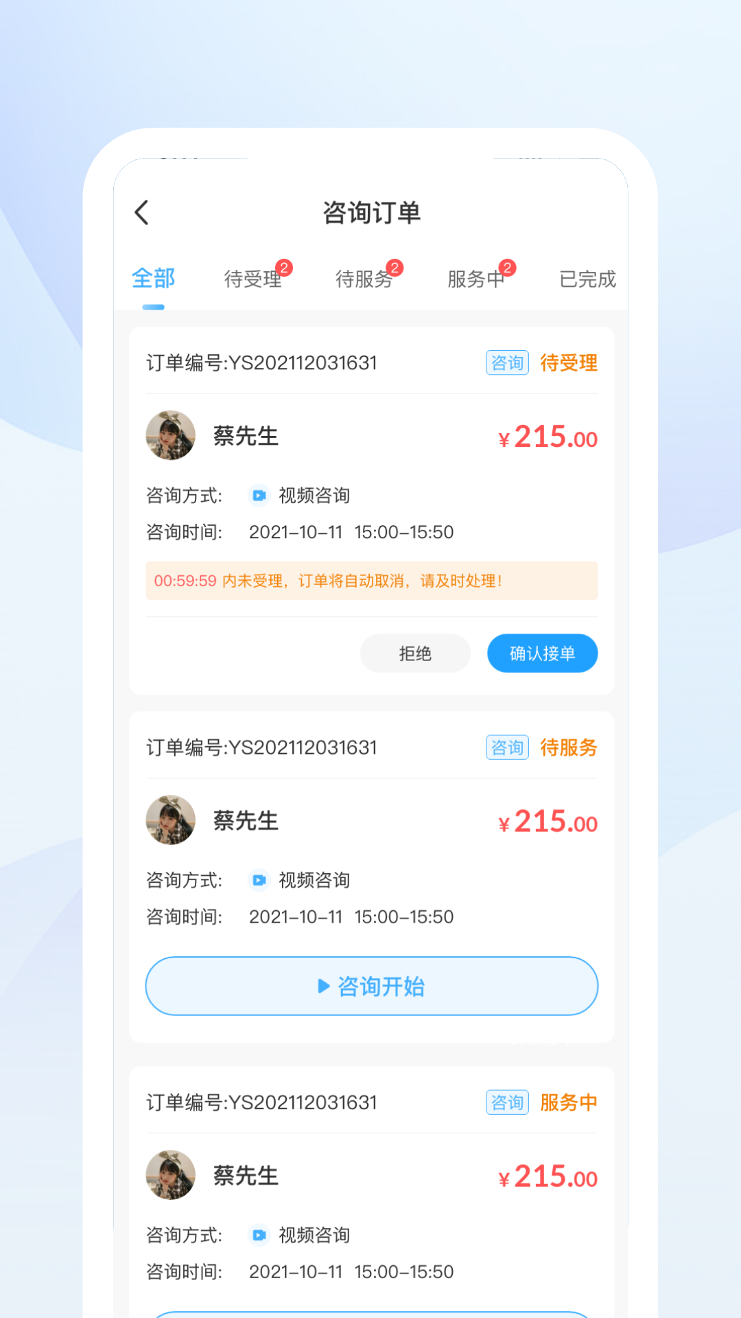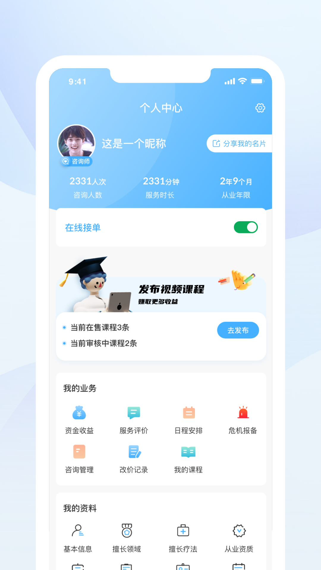 3、咨询师端支持在线接单功能,可根据专业领域选择解答不同类型的心理问题,系统自动匹配最适合的咨询师;