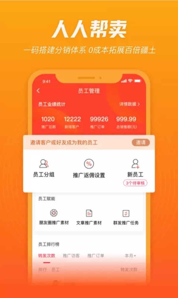 团队招募与管理:在"员工管理"模块可设置多级分销体系,自定义佣金规则,实时查看团队成员业绩表现。