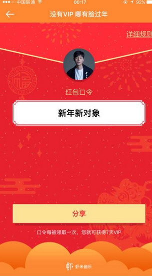 过年活动挺给力,至少领180天。进入虾米客户端,点击口令红包活动。