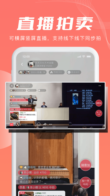 打造沉浸式拍卖体验,支持边聊边拍,可实时发送图片和视频,完美还原线下拍卖会的热烈氛围;