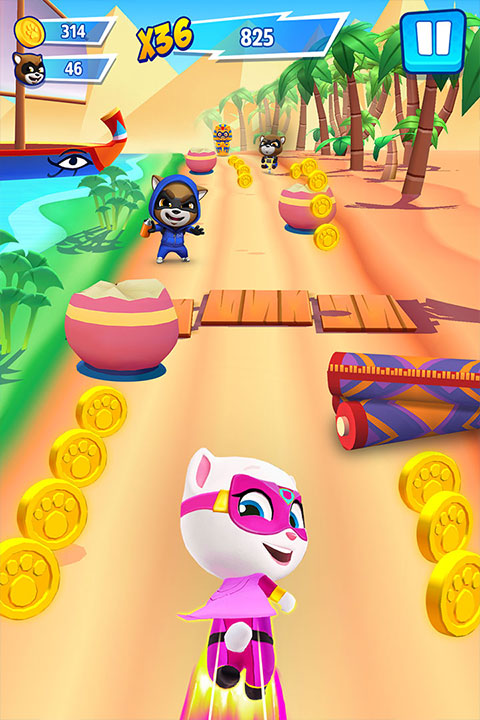 2、玩家可以选择汤姆猫家族中的多位人气角色,包括活泼的安吉拉、憨厚的金杰猫、机灵的汉克狗以及忠诚的狗狗本,每个角色都有独特的跑酷动作;