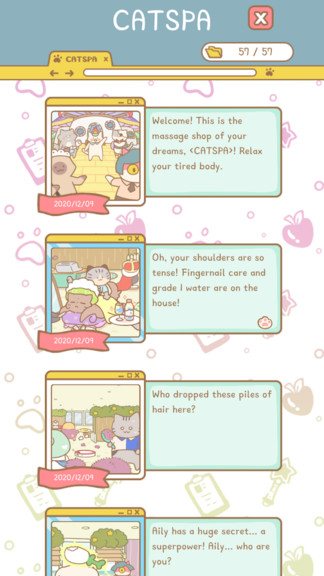 认真倾听客户和员工的声音,收集各种可爱的快照和故事。由猫仙子经营的按摩院可能会发生很多事情!我们保证,一切都在这之上;)游戏内置相册功能,可以保存精彩瞬间。