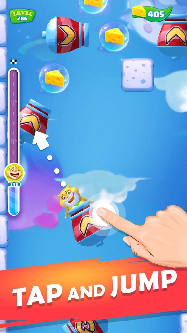 2、把握好时机弹跳才能吃到糖果,游戏考验玩家的反应能力和时机判断,精准的点击才能让小动物完成完美的抛物线跳跃。